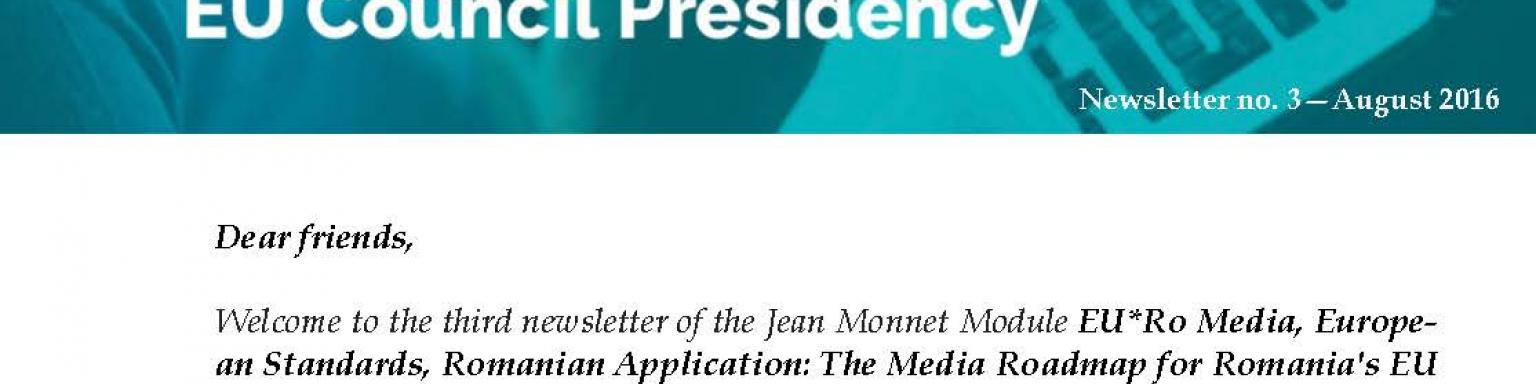 Welcome to the third newsletter of the Jean Monnet Module EU*Ro Media, European Standards, Romanian Application: The Media Roadmap for Romania's EU Council Presidency, co-financed by the European Commission through the Erasmus+ Programme. In this issue you will find information regarding the background and rationale of the proposal, the participants, the objectives, activities and the upcoming events hosted by the National University of Political Studies and Public Administration, in order to promote the project.